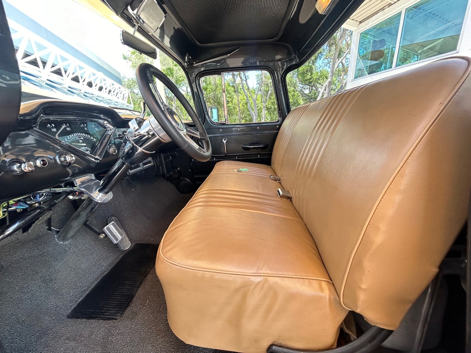 Inside, the truck boasts a tan leather bench seat, Classic Instruments dash, Ididit tilt wheel, custom audio system, billet rearview mirror, leather-wrapped steering wheel, custom door panels, and air conditioning.