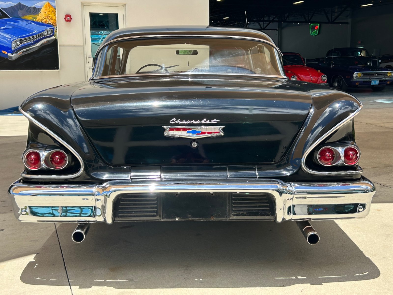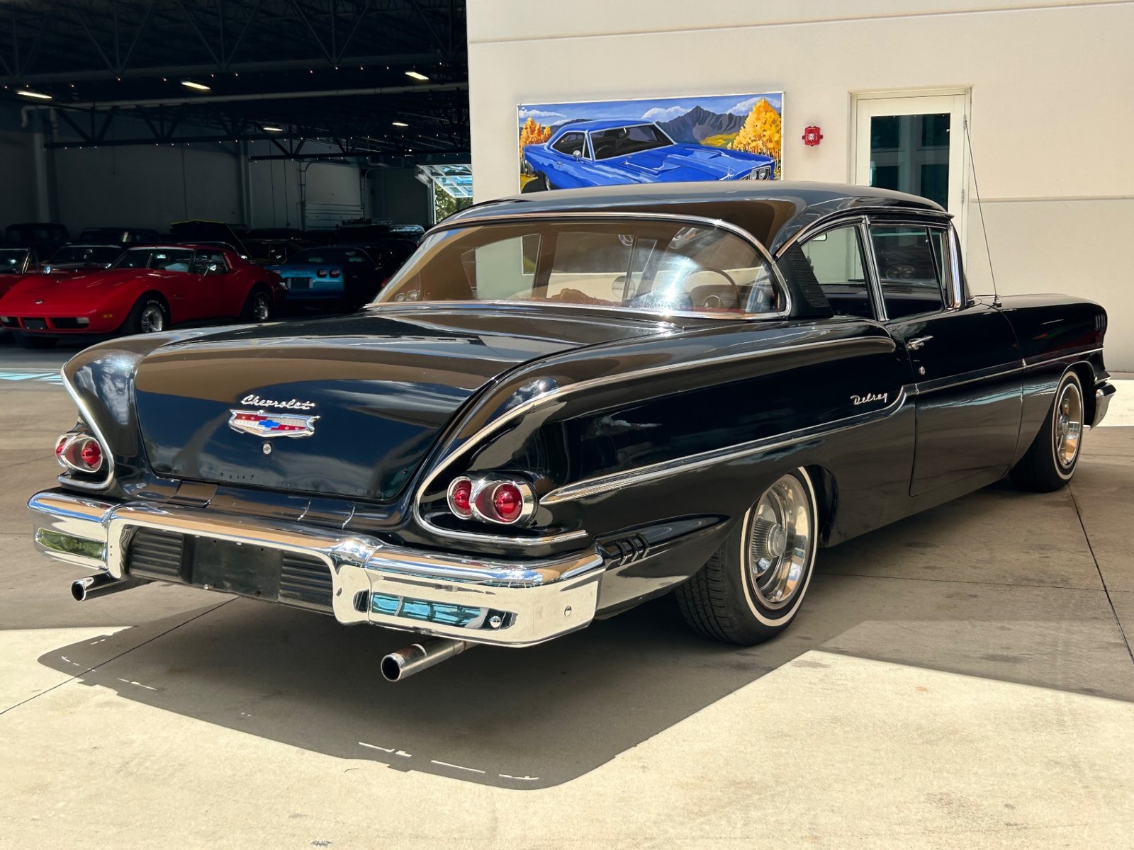 The exterior showcases the 1958 Chevrolet’s iconic broad chrome grille, quad headlights, deeply sculptured rear fenders, side moldings, and Delray badging, all finished in sleek black paint.