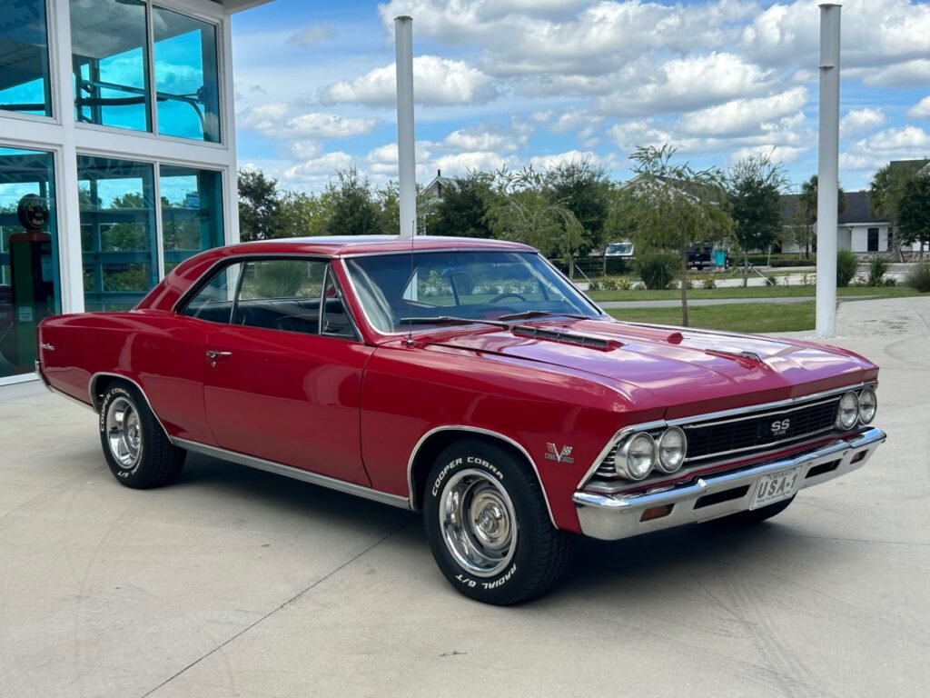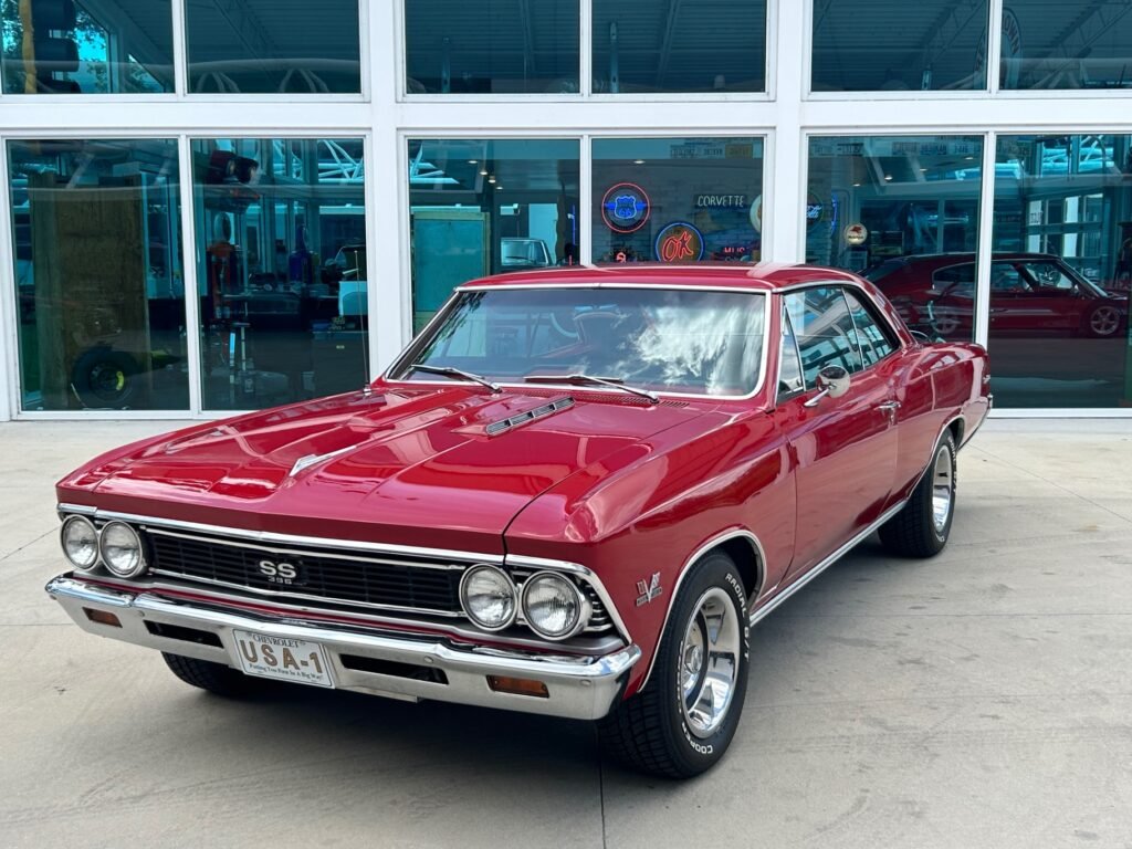 The exterior features a fresh PPG Base coat clear coat red paint job, SS badging, and a menacing sound. The suspension includes a 12-bolt rear end and HD shocks, giving it the right look and stance after a full restoration.
