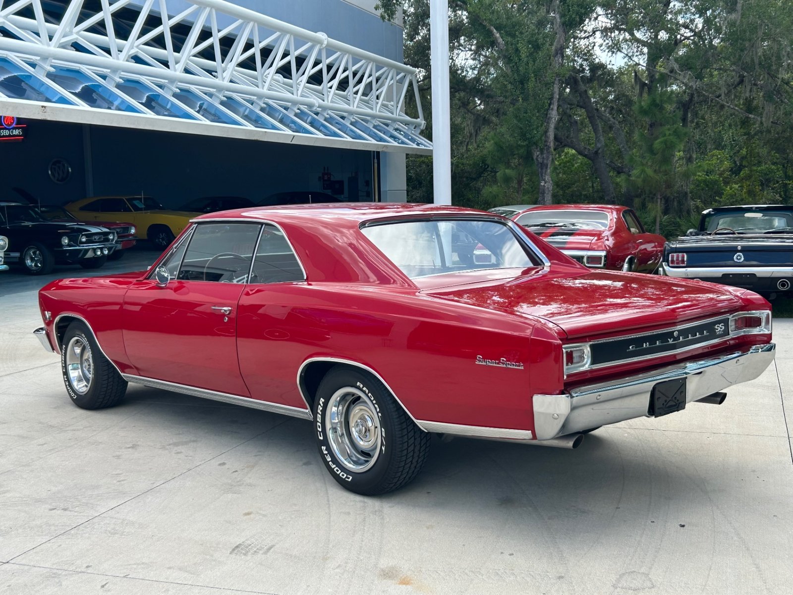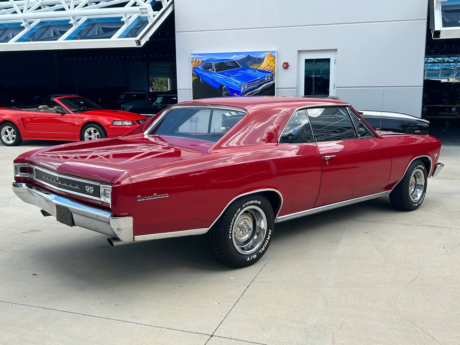 This Chevelle SS is powered by a 396-cubic inch, 375-horsepower engine with an aluminum intake, chrome air cleaner with a 396 decal, chrome valve covers, and a Muncie 4-speed transmission. It features Flaming River power steering, CPP power disc brakes, Vintage A/C, a March Tru-Trac pulley system, aluminum radiator, MSD ignition, Hedman headers with Flowmaster mufflers, and a GM 12-bolt rear end with a 3.73 ratio. The engine is housed in a clean, show-worthy compartment.