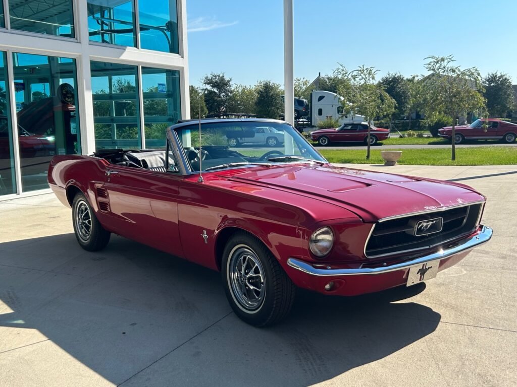 The exterior boasts red paint, a black convertible top, hood and side louvers, factory 5-spoke wheels, white sidewall tires, and chrome bumpers. The body lines and seams are excellent, and the trunk is stock with the correct mat. This Mustang is sure to turn heads with its classic look.
