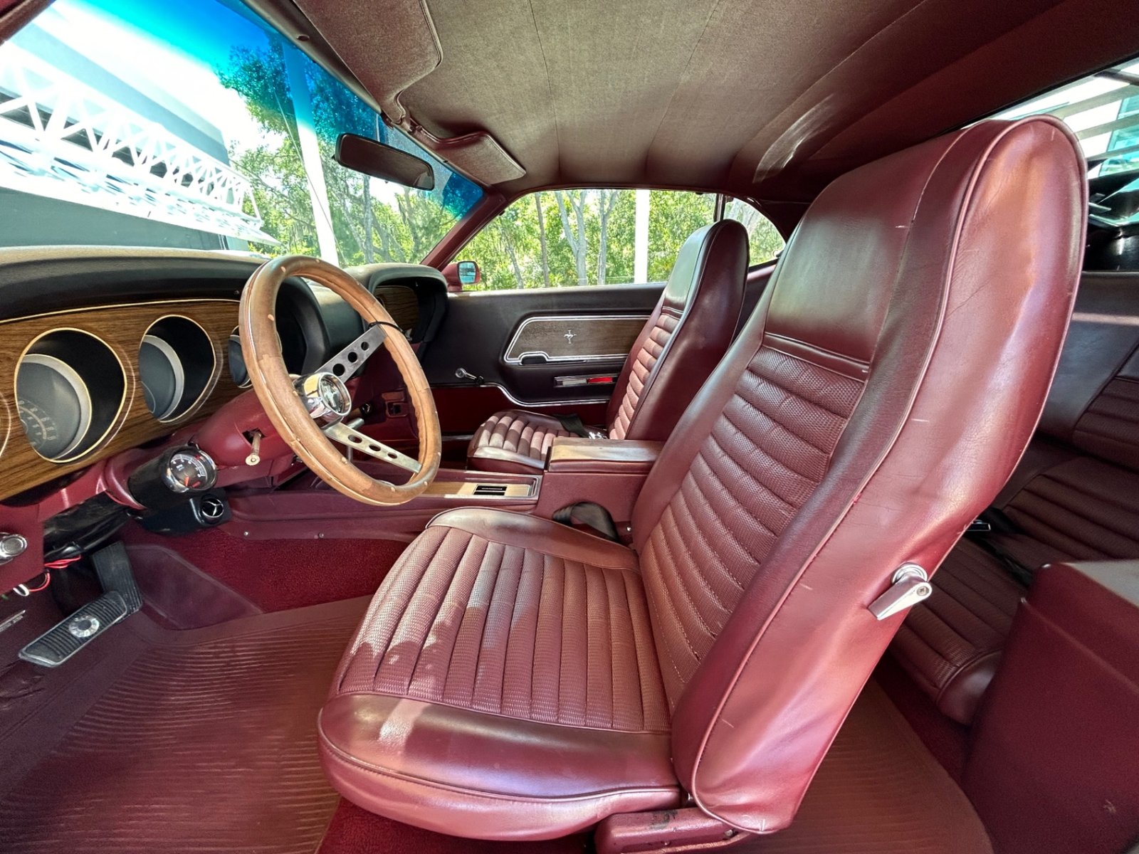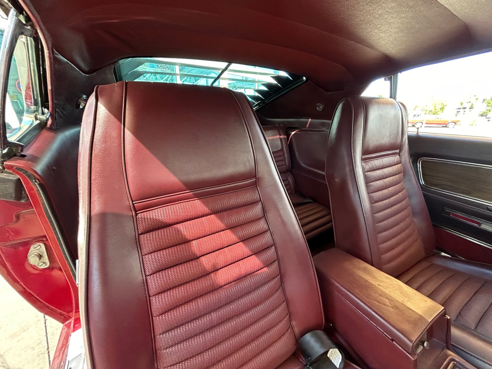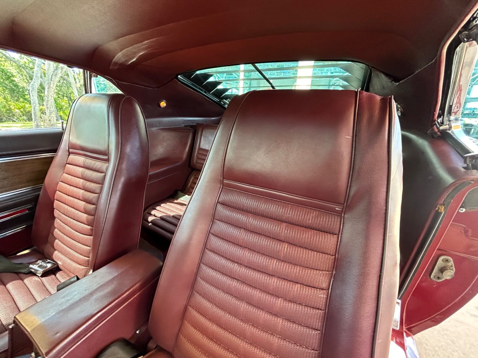 Inside, the original-style maroon interior includes bucket seats with knit vinyl, wood trim, molded door panels, maroon floor mats, updated stereo, wood grain center console with chrome shifter, sport steering wheel, and factory gauges with an aftermarket Sun Pro tach.