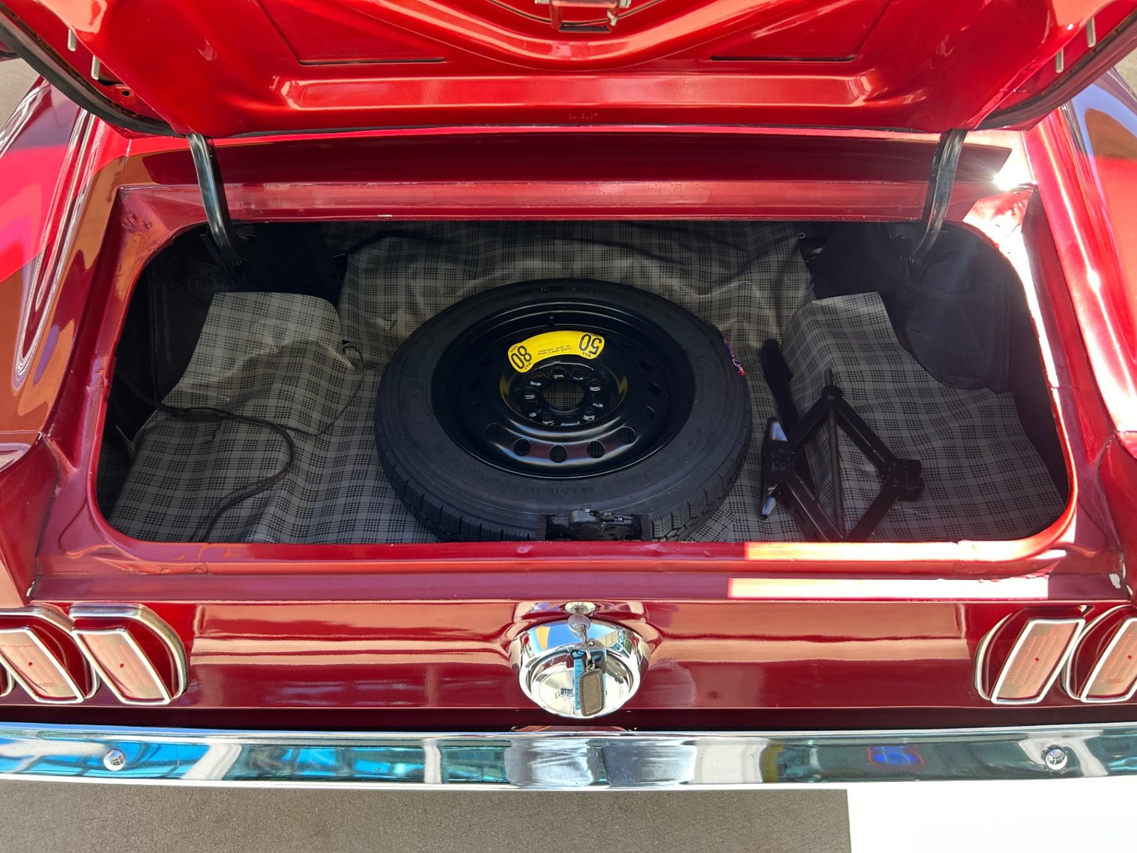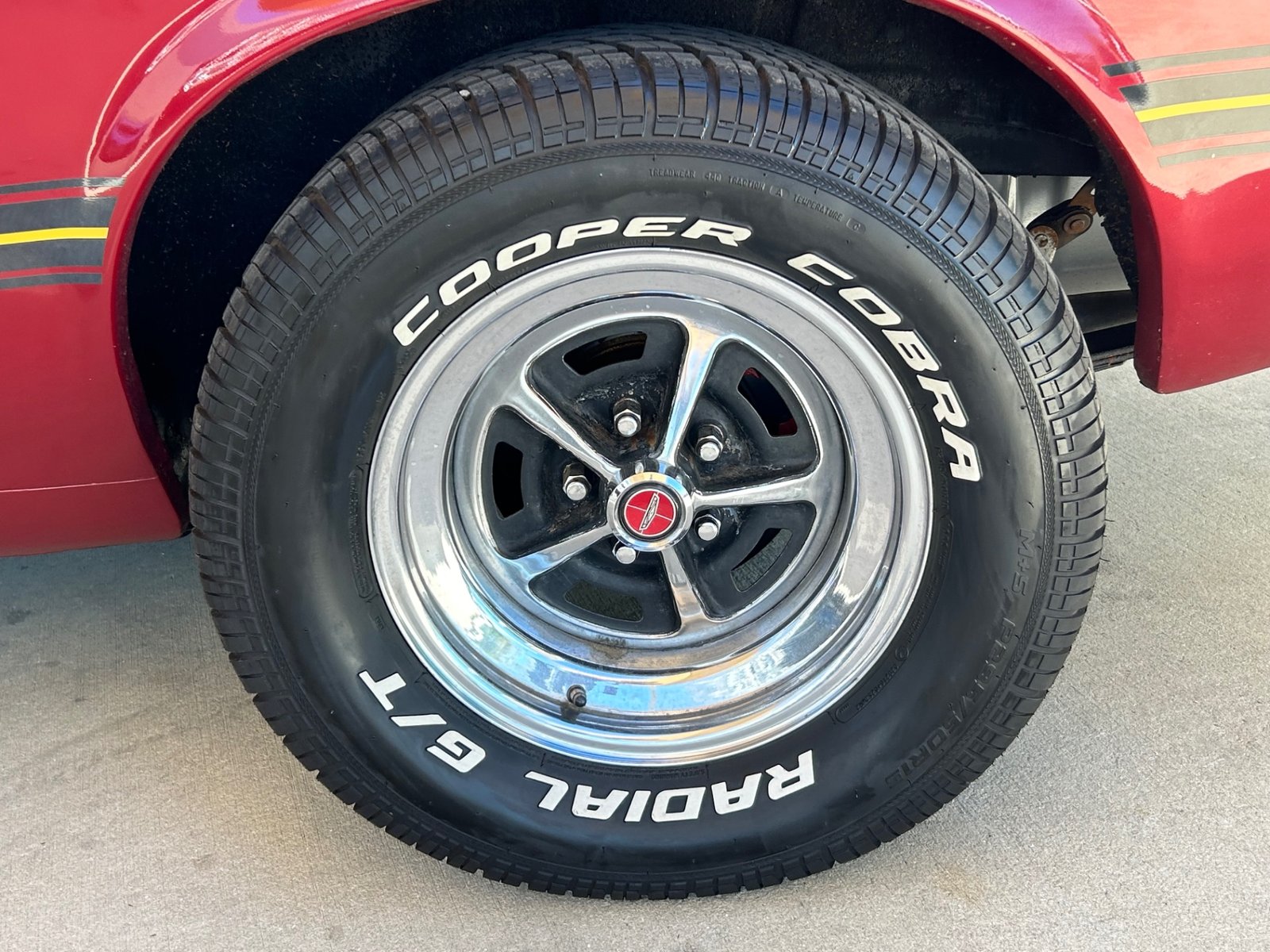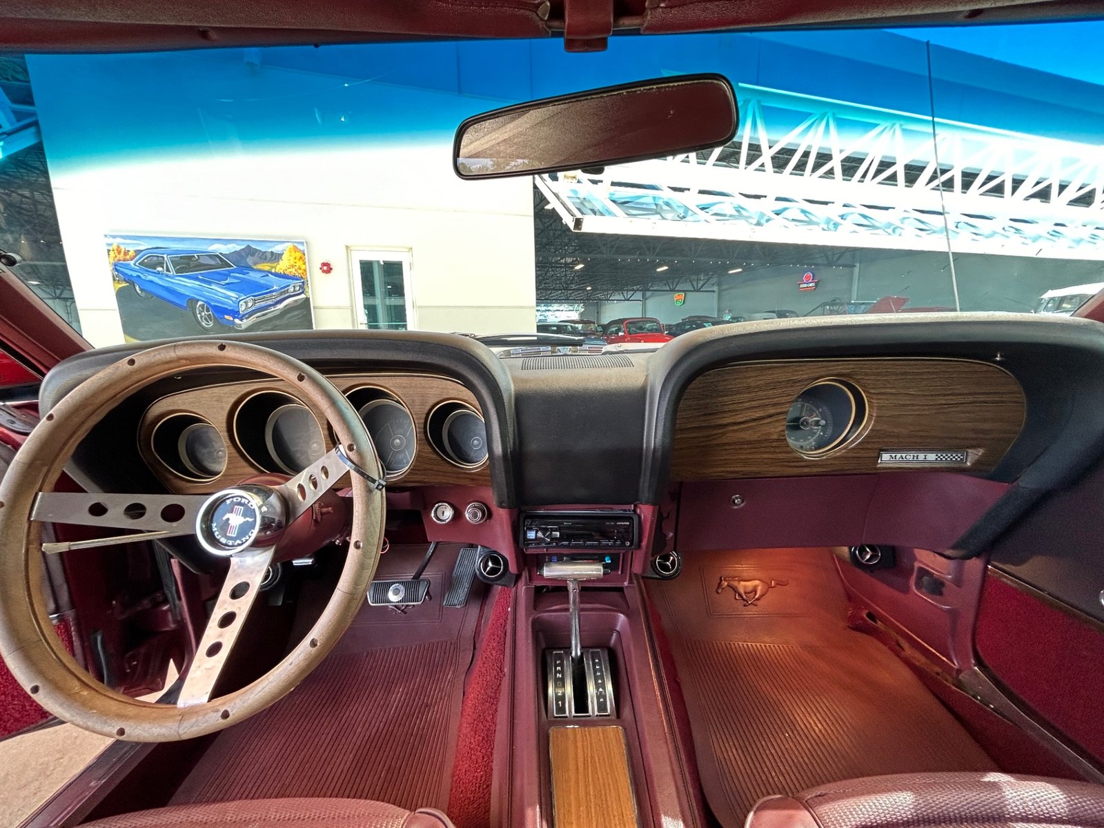 Inside, the original-style maroon interior includes bucket seats with knit vinyl, wood trim, molded door panels, maroon floor mats, updated stereo, wood grain center console with chrome shifter, sport steering wheel, and factory gauges with an aftermarket Sun Pro tach.