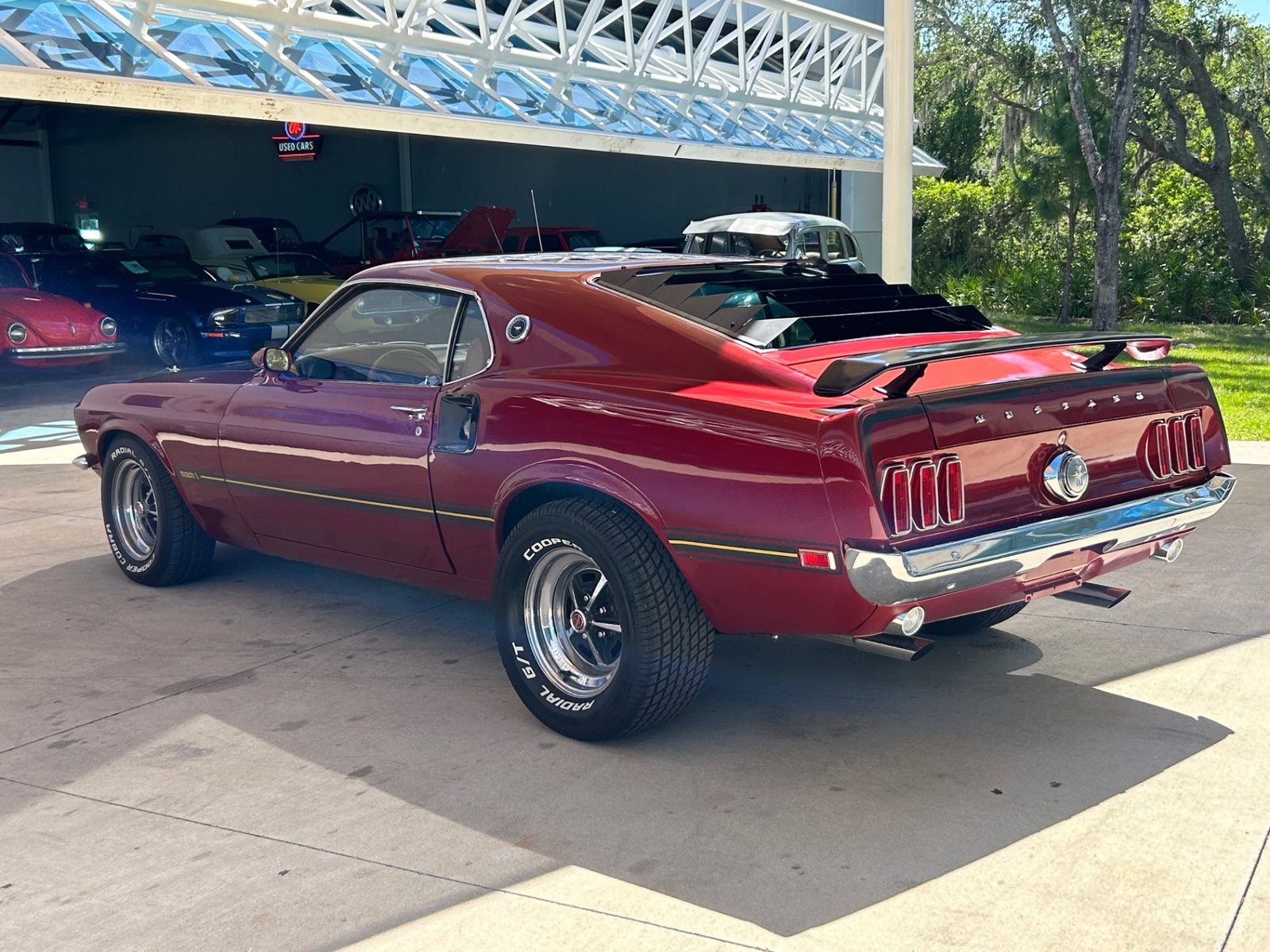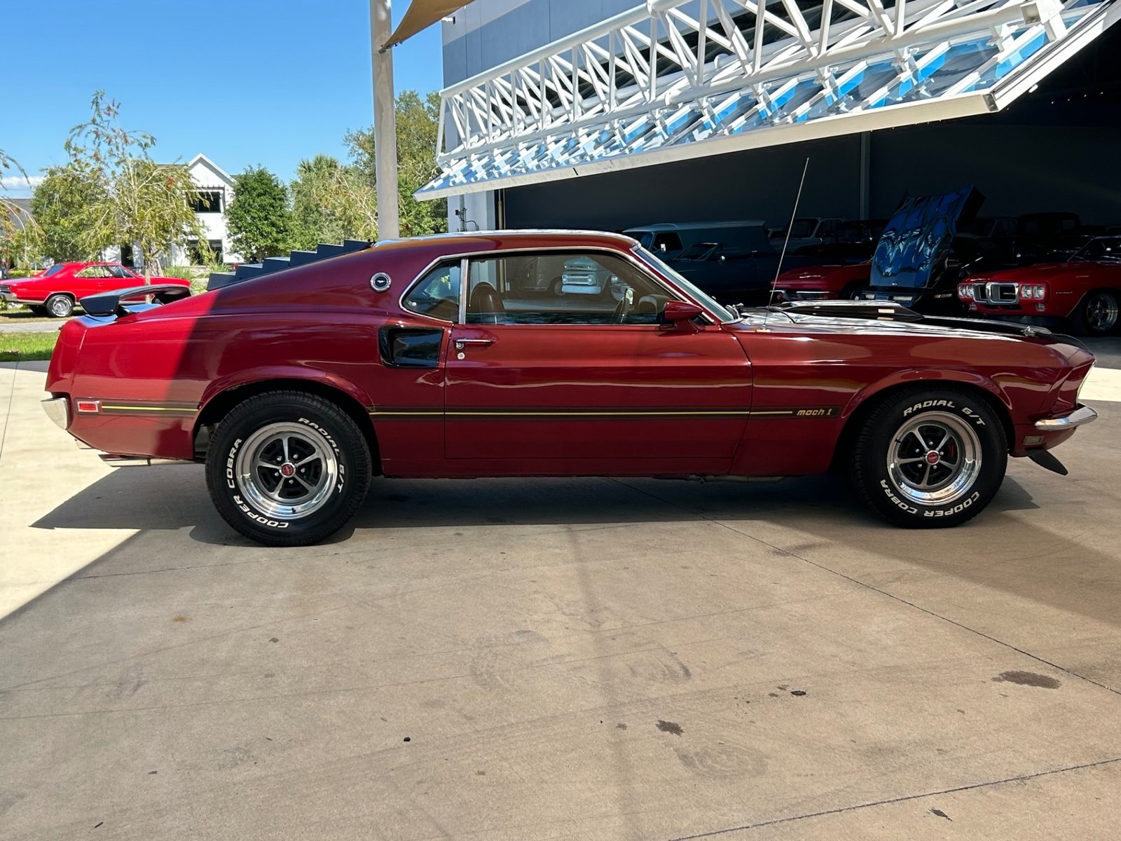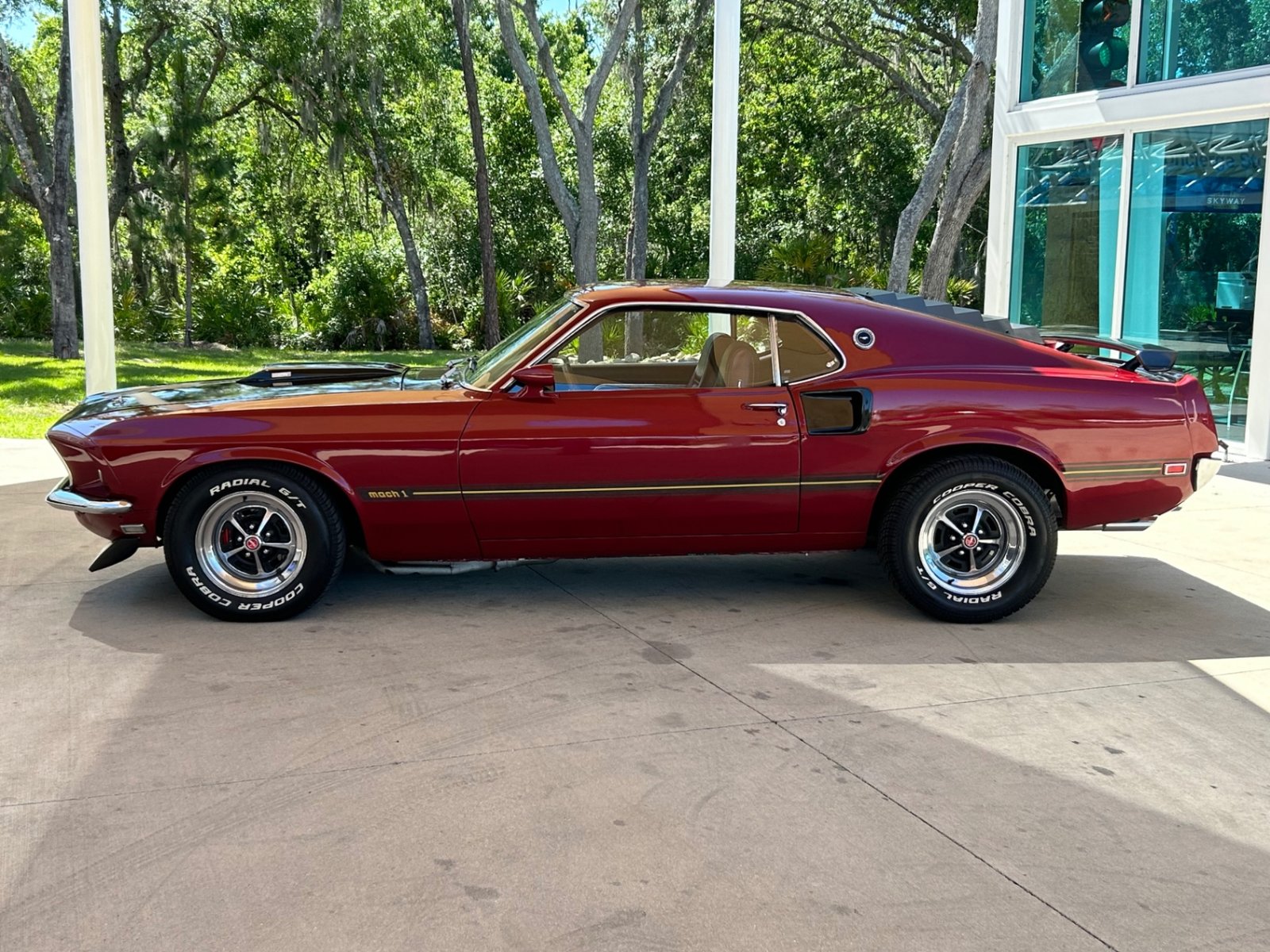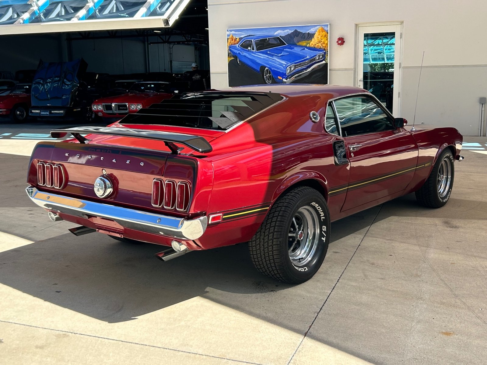 This Mach 1 features a blue Ford Racing 351 Cleveland engine with chrome open-element air cleaner, polished Motorsport valve covers, aluminum intake, Accel coils, performance wires, modified distributor, air conditioning, power steering, and dual exhaust. It rides on factory sport wheels with Cooper Cobra Radial G/T tires.