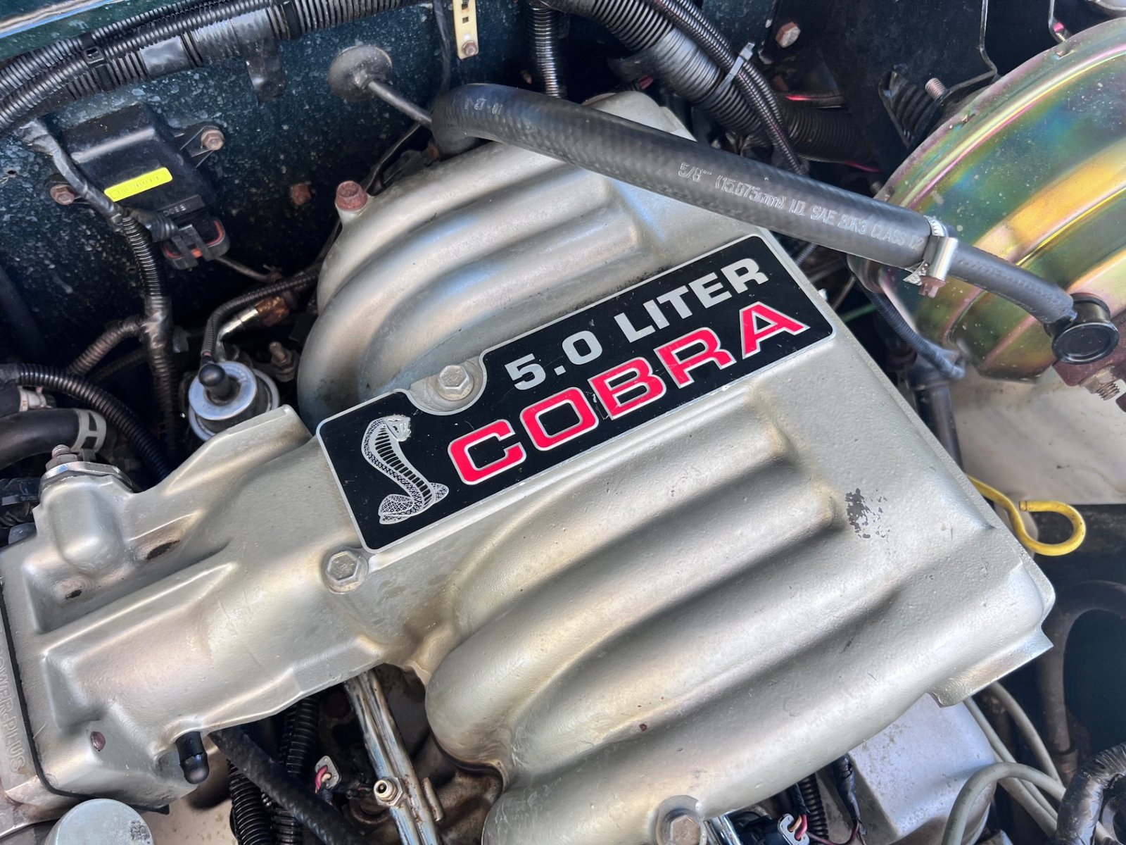 Under the hood of this Jeep is a 5.0 H.O. Ford Mustang Cobra V8 engine with factory fuel injection, a 5-speed manual transmission, dual exhaust, power steering, power brakes, and an open element ram air cleaner. It’s paired with a 5-speed manual transmission and rides on polished mag wheels with BFG all-terrain tires.